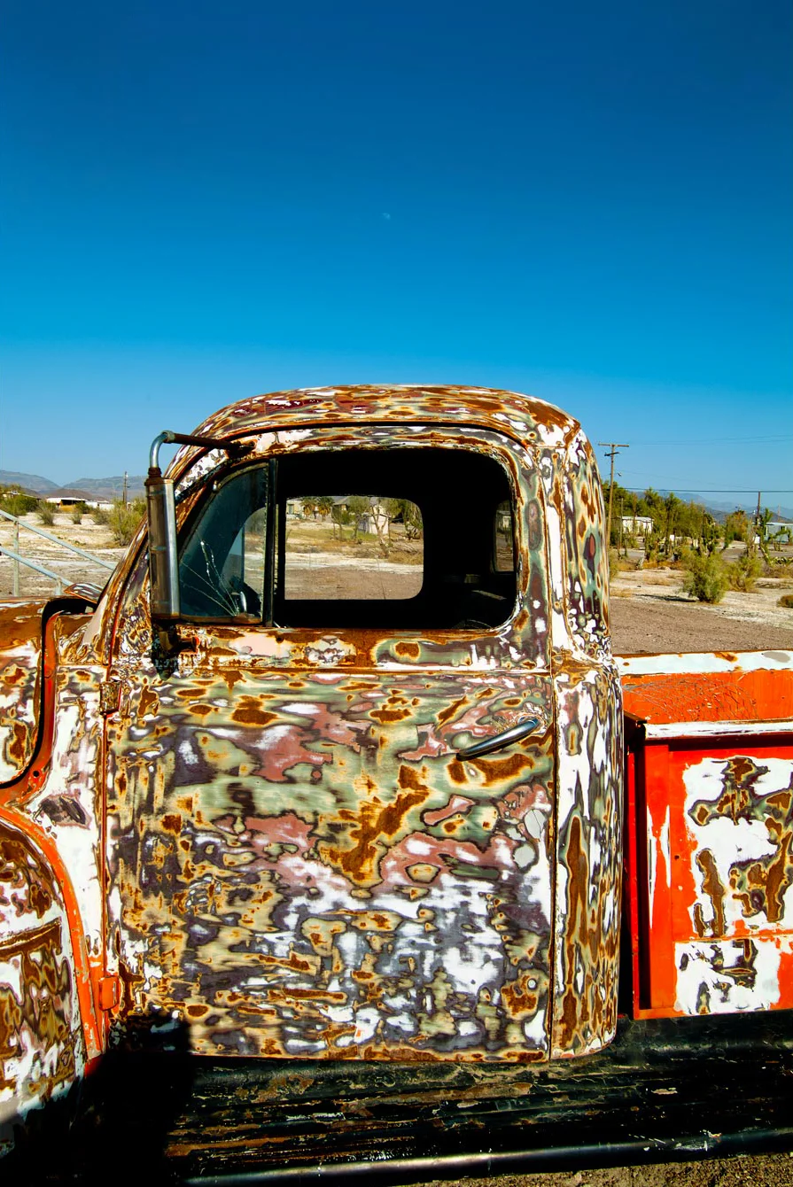Truck door abrasion. Notice the door handle, and hinges. Taken on the edge of Death Valley, in Tecopa. Truck has been repainted many times.